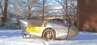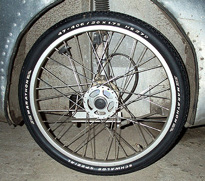 Für bessere Bodenhaftung wurden die schmalen, profillosen Hochdruckreifen gegen breite Profilpneus getauscht. Die Reifen passen gerade noch in den Radkasten und der Rollwiderstand ist entsprechend höher. Mit diesen Reifen ist das Alleweder auch bei Glätte noch gut zu fahren.