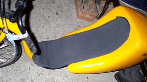und der Original - Flevobike - Sitzmatte. Die durchgescheuerte Stelle zeigt